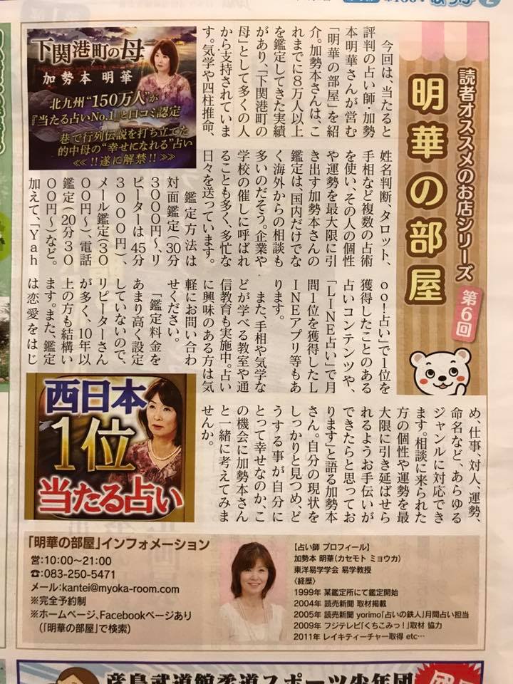 地域情報新聞「ほっぷ」さんの下関版(6月2日号)で、読者のオススメのお店シリーズで「明華の部屋」を紹介して頂きました。